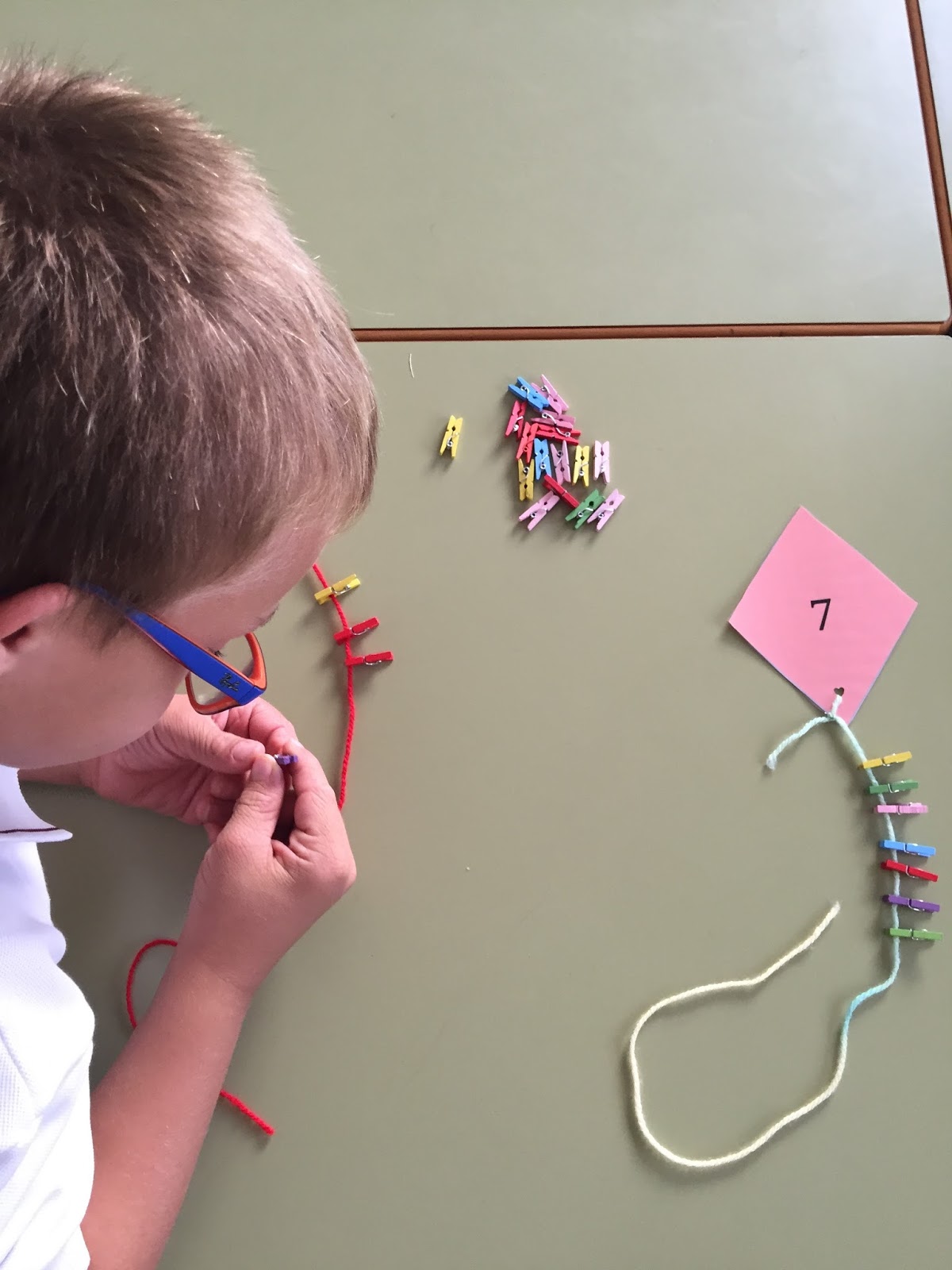 Tienen que colocar tanta pinzas como indica el número. Hay dos grados de dificultad , pinzas pequeñas o pinzas medianas, dependiendo de la destreza del alumno se usará un tamaño u otro.